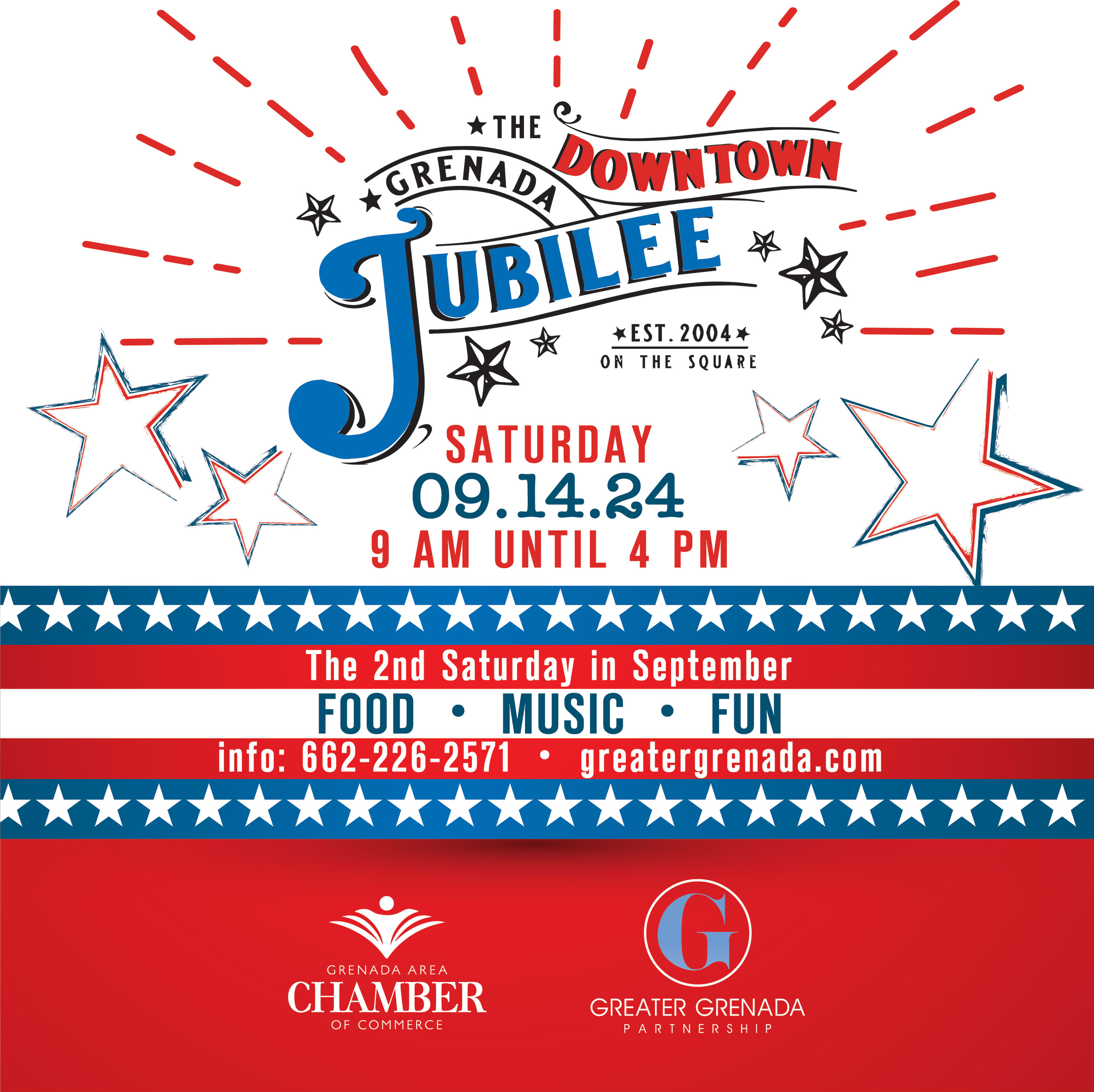 The Downtown Jubilee will be held on the historic square in Grenada, MS from 9 a.m. until 4 p.m. This event is hosted by the Grenada Area Chamber of Commerce. It will be a fun-filled family day of music, arts and crafts, food, children's activities, and much more!